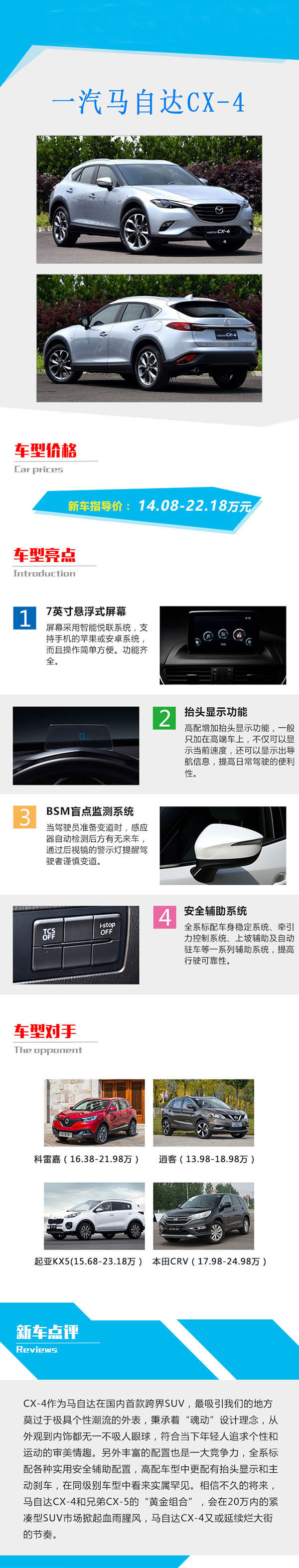 【SUV中國網(wǎng)】馬自達(dá) CX-4在北京車展的首次驚艷亮相,注定讓許多車迷念念不忘,人氣持續(xù)高漲。終于在21號(hào)晚上,眾人朝思暮想的CX-4迎來了正式上市,此刻相信有不少朋友已經(jīng)準(zhǔn)備好銀子到4S店提車了,但先別著急,看完推薦的幾款車型再?zèng)Q定。