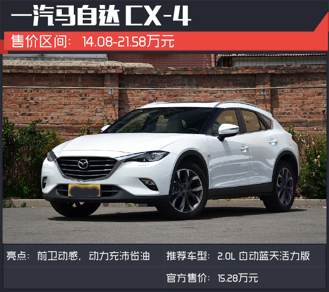 馬自達CX-4是一款劍走偏鋒的SUV,造型十分的動感,19寸超大輪轂更像是被架高的跑車,并搭載了馬自達創馳藍天技術2.0L和2.5L發動機,動力及油耗都很不錯。 2.0L 自動兩驅藍天活力版配置還是不錯的,前排側氣囊、電子手剎(上坡輔助、自動駐車)、天窗、LED頭燈、無鑰匙啟動都有體現。
