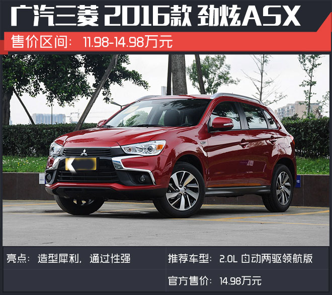 新勁炫ASX外觀比以往更激進,前衛運動的設計不僅提升了顏值,還在用車各方面設計很均衡,足夠滿足年輕人的各種用車需求。2.0L CVT兩驅領航版不僅提供了前后排氣簾、膝部氣囊安全措施,還配備了無鑰匙進入/一鍵導航、自動空調、后視鏡電動折疊、倒車影像、前排座椅加熱,用車功能 在同級來看十分齊全。