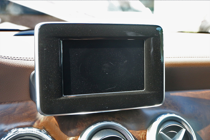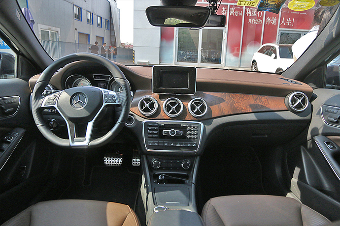 奔馳比奧迪Q3略有提高,雖然頂配車型中控臺上緣也有皮質材料,方向盤持握部分也有打孔,但是中控臺邊框可以占到1/2面積的液晶屏幕出賣了奔馳。空調面板雖然經過了巧妙地偽裝,溫度刻度看起來很像是自動空調,但這確實貨真價實的手動貨。