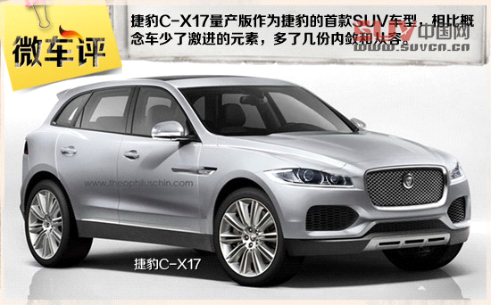 外觀方面:從假想圖看,C-X17量產版車型基本延續了其概念車型的設計理念,車前臉采用捷豹全新家族式設計理念,細節部分更為低調內斂,前大燈LED樣式、底部防擦板、后包圍等部分都沒有概念車那么激進。