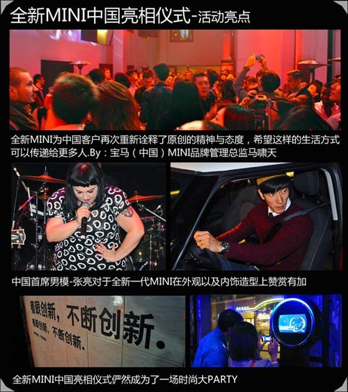 MINI品牌一直都以時尚為主題,這次全新MIN在上海的亮相儀式也不例外,現場聚集了各路時尚人群,儼然成為了一個時尚大PARTY,搖滾樂、美酒、香煙一個都不能少,這就是時尚的代名詞,全新MINI時尚大PARTY,Are you ready?GO~~~