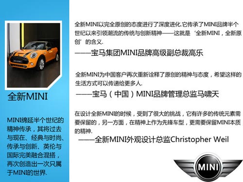 寶馬集團MINI品牌高級副總裁高樂先生(Mr. Jochen Goller)表示:“全新MINI以完全原創(chuàng)的態(tài)度進行了深度進化。它傳承了MINI品牌半個世紀以來引領潮流的傳統(tǒng)與創(chuàng)新精神——這就是‘全新MINI,全新原創(chuàng)’的含義。相信它與前代車型一樣,會令全球車迷為之興奮。今天,我們在上海見到了中國的MINI社區(qū),正是他們的豐富多彩,讓MINI在中國發(fā)展得如此迅速。”