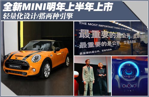 2013年7月,MINI官方發(fā)布了概念車MINI VISION的效果圖,其代表著全新MINI的發(fā)展方向。全新MINI于11月18日在牛津工廠進行首發(fā)后,又相繼在洛杉磯、東京亮相,最終于21日完成了在中國的首秀。同時網通社了解到:全新MINI采用了大量的輕量化設計,將于明年上半年正式登陸中國市場,并為消費者匹配了兩種不同排量的引擎。