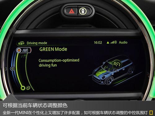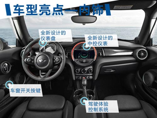 內飾方面,全新MINI將更重視實用性及舒適性,設計更大車內空間,采用“懸浮式”中控臺以及更時尚的出風口造型。值得一提的是,全新MINI的整體內飾可根據基本或互動模式的調節(jié)變換裝飾燈光顏色,這也體現了MINI設計更加注重駕駛樂趣。
