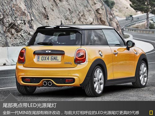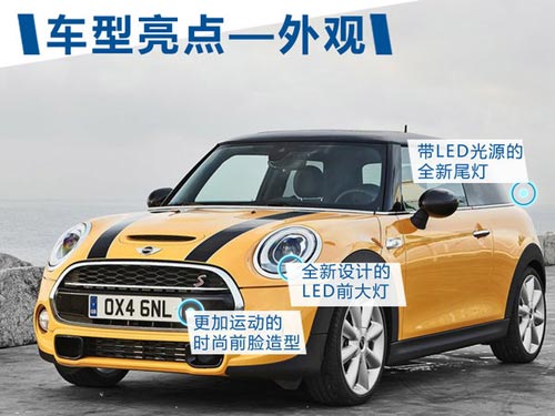 全新MINI體現了家族式經典的外觀設計,車身整體更顯圓潤,六邊形進氣格柵與保險杠、橢圓型大燈更好融合,并采用金屬裝飾條包裹,迎合年輕消費者喜好。尾部的并列雙排氣管造型也將在全新MINI車型上體現。此外,MINI也將采用輕量化材料的“有機金屬”,進一步提升其燃油經濟性。