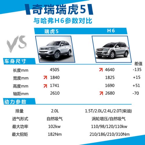 瑞虎5采用iAUTO均衡智造技術(shù)平臺(tái)打造,其車身尺寸分別為:4505/1840/1741mm,軸距為2610mm,同級(jí)別車型哈弗H6身尺寸分別為4640/1825/1690mm,軸距為2680mm,單從尺寸數(shù)據(jù)來看二者各有優(yōu)勢(shì),但瑞虎5在配置上擁有無鑰匙進(jìn)入/啟動(dòng)、倒車影像、倒車?yán)走_(dá)、GPS導(dǎo)航、DVD影音娛樂系統(tǒng)、四門一鍵式升降門窗、電動(dòng)調(diào)節(jié)座椅、電動(dòng)防夾天窗、BOSCH9.0版本ESP、HHC坡道輔助系統(tǒng),在同級(jí)別車型中優(yōu)勢(shì)較為明顯,新車上市后將競爭對(duì)手直接鎖定在了哈弗H6車型上。