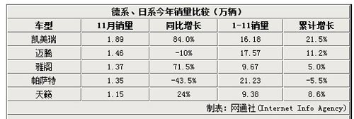 乘聯(lián)會(huì)的最新統(tǒng)計(jì)數(shù)據(jù)顯示,11月銷量前五的全是德日車型。日系B級(jí)“三強(qiáng)”的凱美瑞,11月實(shí)現(xiàn)1.89萬輛,同比高增84.0%。雅閣銷量1.37萬輛,排名第三位,同比高增71.5%。新天籟銷量1.15萬輛,排名第五位,同比也有24.0%的增長(zhǎng)。長(zhǎng)期銷量最高的帕薩特,該月銷量同比大跌43.5%至1.35萬輛,在年內(nèi)再次跌落榜首,排名降至第四位(7月排名第三)。邁騰銷量雖然同比下跌一成,不過以1.47萬輛的銷量仍然排名第二位。日系三強(qiáng)對(duì)大眾形成了鐵三角式的圍攻。