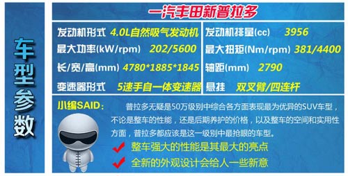 車型簡介:在2013年的廣州車展期間,一汽豐田新款普拉多的價格正式公布,而就在最近,這款全新車型正式上市,其售價區間為53.0萬-67.6萬。