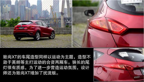 緊繃的腰線貫穿車身與尾燈呼應,它的車尾造型同樣以運動為主題,為了進一步營造運動氛圍,設計師還為致尚XT增加了擾流板。致尚XT的運動主題很有吸引力,就算它的性能并不太出眾,但氛圍一定要營造好,就像配合紅色卡鉗的五幅輪轂。它的成功在于準確的抓住了消費者注重外形的心理,并專心致力于此,打造靚麗的外形并以此為標簽,毋庸置疑,他們做得非常出色!