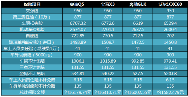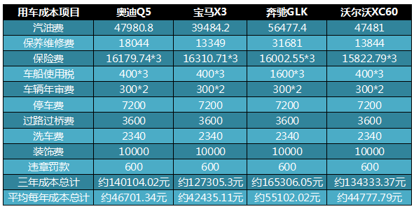 奧迪Q5、寶馬X3、奔馳GLK、沃爾沃XC60是四款非常經典的豪華SUV車型,這四款車的動力性能出色,具備很好的舒適性,同時在業界的口碑也很不錯。那么這四款車型養車成本如何?誰會更便宜一些呢?