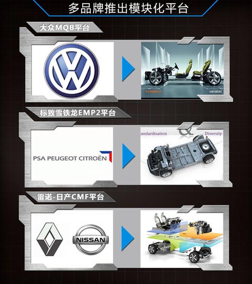 在大眾推出MQB平臺后,“模塊化”生產已然成為一種趨勢,更多廠商宣布使用模塊化平臺。標致雪鐵龍集團此前宣布啟用全新的EMP2平臺,該平臺引入模塊化的設計思路,成為繼大眾之后全球第二個使用模塊化平臺設計的廠商。標致集團CEO畢高成在接受記者采訪時表示:“EMP2平臺可生產308以上的車型。”這預示著未來標致雪鐵龍在華的多款換代車型均將在此平臺投產。此外,雷諾-日產聯盟在去年也宣布推出CMF全球通用模塊系列架構,其涉及的范圍更廣,除底盤框架外,還包括了座艙的機構及整車電器組件的共用,這樣的做法可有效節約40%的成本,同時縮短車輛更新換代的時間,進而與大眾集團的MQB平臺相抗衡。