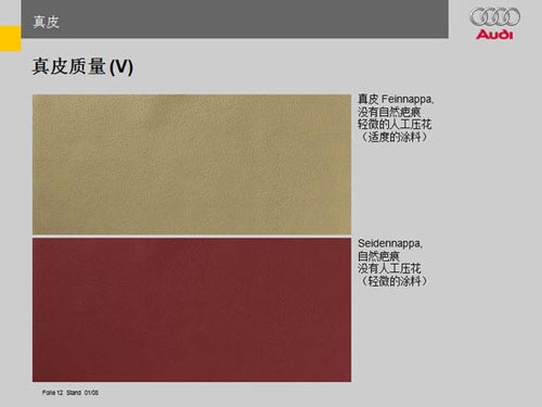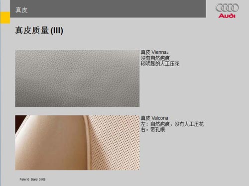 而在奧迪的內(nèi)飾皮革之中我們就可以見到Feinnappa和Seidennappa的字樣,其實它們都是合成詞。Fein在德語中有細致精巧的意思,而Seide則是絲綢的意思,搞明白了前綴的意思,對皮革的質(zhì)地也就不難理解了。其實Feinnappa的表面瑕疵被人工修飾,有較為輕微的人工壓花,而Seidennappa則只是上了一些涂料,皮質(zhì)的原有紋理被保留下來,它們可以看做半粒面與全粒面的區(qū)別。