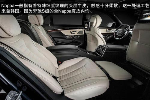 剛剛完成換代的奔馳S級的頂配車型就使用了全Nappa真皮的內(nèi)飾設(shè)計,從方向盤、儀表板到座椅都有著極佳的柔軟觸感,經(jīng)過細微修飾的皮革紋理給人完美的視覺享受。