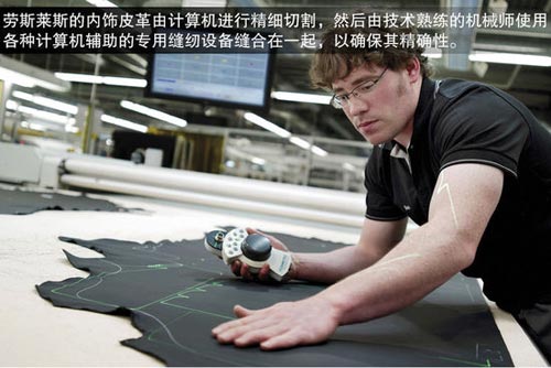 勞斯萊斯的內(nèi)飾皮革由計算機進行精細切割,然后由技術(shù)熟練的機械師使用各種計算機輔助的專用縫紉設(shè)備縫合在一起,以確保其精確性。他們負責(zé)一輛車內(nèi)的不同部分,但不限制部分,彼此之間也會進行技藝的較量。他們使用雙針縫紉機在真皮上面工作,使用一種稱作“魚骨”的老式工具推動真皮,確保針腳的均勻,在拐角處也不例外。