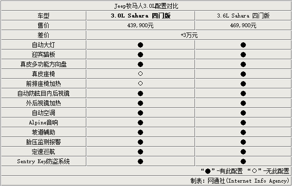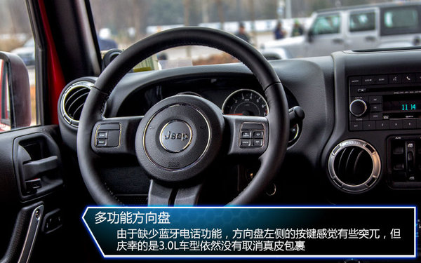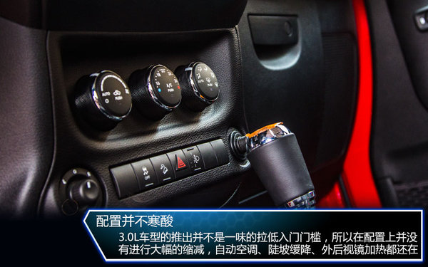 可以明確說明的是,雖然3.0L牧馬人排量低,價格下調(diào),但是配置方面仍沒有大幅縮減,在3.6L車型上的大部分配置全部保留,只是真皮座椅和前排座椅加熱進行了減裝,不過對于相差3萬元的售價來說,缺少的配置算不上有多重要。