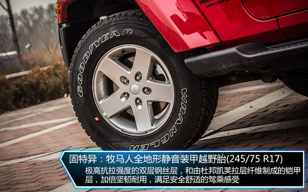 外掛式全尺寸備胎也是它所具有的經(jīng)典元素之一,而高位剎車燈也位于備胎上方,來自固特異的全地形靜音輪胎讓牧馬人提升了公路性能,與此同時對于越野也有著一定的幫助,245mm的寬度也足矣滿足3.0L引擎所產(chǎn)生的動力。