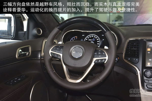 內飾的設計采用了主題化模式,靈感來自全球五大風景勝地,包括摩洛哥夜色,新西蘭海岸,尼泊爾,維蘇威火山和美國大峽谷。不同色調的真皮及木質飾條都極富質感,帶來與眾不同的舒適感受。儀表盤中央提供了一塊7英寸TFT顯示屏,不僅可以用顯示模擬儀表,更有專為越野提供的車輪位置以及傳動顯示。三幅方向盤依然是越野車風格,粗壯而沉穩。而實木與真皮混搭完美詮釋著豪華,運動化的換擋撥片的加入,提升了駕駛樂趣及便捷性。