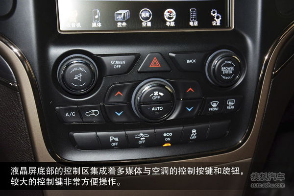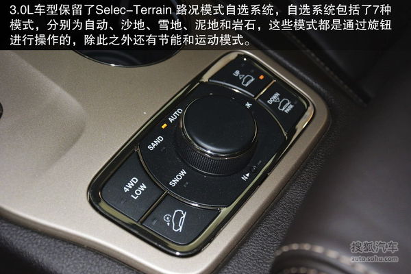 3.0L車型保留了Selec-Terrain 路況模式自選系統,自選系統包括了7種模式,分別為自動、沙地、雪地、泥地和巖石,這些模式都是通過旋鈕進行操作的,除此之外還有節能和運動模式。