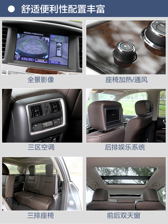 豐富的舒適便利性配置是居家車型不可或缺的特點,英菲尼迪QX60提供了三區空調、前后雙天窗、座椅通風和加熱、后排娛樂系統、全景影像等功能,再加上7座的設定,全家一起出行可以做到很舒適。