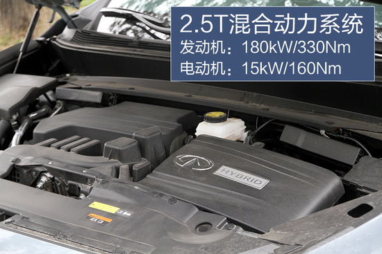 新款英菲尼迪QX60依然提供混合動力和3.5L汽油發動機兩款動力系統,全部匹配可模擬7速的CVT無極變速箱,我們本次試駕的是混動版本,由一臺2.5T渦輪增壓汽油發動機和電動機同時提供動力。
