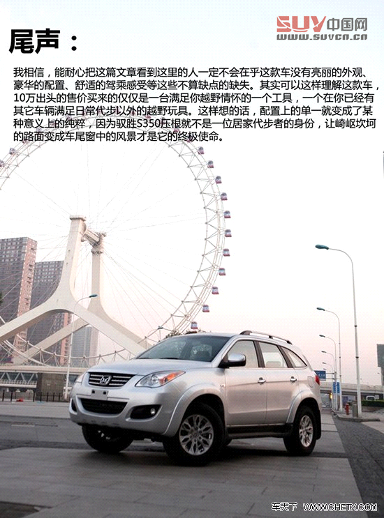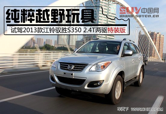 還真有!來(lái)自江鈴的馭勝(報(bào)價(jià) 參數(shù) 圖片 論壇)S350也許并沒(méi)有出現(xiàn)在各大車(chē)市的熱門(mén)銷(xiāo)量榜,但這臺(tái)并不那么鮮為人知的車(chē)型卻是一款實(shí)實(shí)在在的硬派越野車(chē)。今年6月,江鈴?fù)瞥隽?013款馭勝S350,該車(chē)全系共有兩種發(fā)動(dòng)機(jī)(2.4升渦輪增壓、2.4升自然吸氣),分別擁有兩驅(qū)和四驅(qū)共四款車(chē)型,官方將新款車(chē)型稱(chēng)之為“特裝版”。經(jīng)過(guò)查看配置表得知,所謂“特裝版”就是去掉所有多余浮華的配置,只對(duì)日常駕駛需求有所保留。也就是說(shuō),四款車(chē)型除了動(dòng)力排量以及兩輪/四輪驅(qū)動(dòng)不同外,其它配置,全系均為一個(gè)標(biāo)準(zhǔn)。突然覺(jué)得這么純粹的車(chē)并不需要太多的廢話(huà)來(lái)鋪墊,來(lái)吧,馬上帶你感受那種最原始的硬派越野。