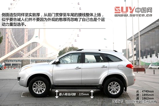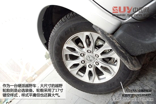 側(cè)面造型同樣堅(jiān)實(shí)敦厚,從前門(mén)貫穿至車(chē)尾的腰線(xiàn)整體上揚(yáng),似乎要告誡人們并不要因?yàn)橥庥^(guān)的憨厚而忽略了自己也是個(gè)運(yùn)動(dòng)力量型選手。作為一臺(tái)硬派越野車(chē),大尺寸的越野輪胎則是必選裝備。馭勝S350特裝版采用了一款來(lái)自臺(tái)灣的FEDERAL全地形輪胎,尺寸為265/65R17,通過(guò)數(shù)據(jù)可以看出這款輪胎的胎寬以及扁平比都是為了越野而打造的。輪轂采用了17寸鏤空樣式,樣式平庸但也還算大氣。全地形輪胎的配備必然是為了可觀(guān)的通過(guò)性,而225mm的最小離地間隙也同樣是通過(guò)性的有力保障。