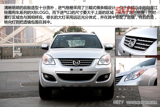 清晰明朗的前臉造型十分質(zhì)樸,進(jìn)氣格柵采用了三幅式橫條幅設(shè)計(jì),位于條幅正中的則是江鈴乘用車(chē)系列的X形LOGO。而下進(jìn)氣口的尺寸要大于上面的區(qū)域,采用了黑色格柵,同時(shí)霧燈區(qū)域也與其相呼應(yīng)。修長(zhǎng)的大燈采用遠(yuǎn)近光分體式,并在其中安配了透鏡,特別的是,轉(zhuǎn)向燈則把透鏡包圍在其中。