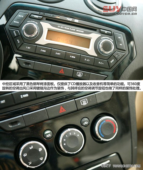 前文提到,特裝版的馭勝S350去掉了所有日常駕駛以外的配置,一切從簡(jiǎn)單實(shí)用出發(fā)。被去掉的配置還包括了液晶屏,中控區(qū)域采用了黑色鋼琴烤漆面板。僅提供了CD播放器以及收音機(jī)等簡(jiǎn)單的功能。可360度旋轉(zhuǎn)的空調(diào)出風(fēng)口采用鍍鉻溝邊作為裝飾,與其呼應(yīng)的空調(diào)調(diào)節(jié)旋鈕也做了同樣的裝飾處理。所有的按鍵質(zhì)感以及做工都非常不錯(cuò),在自主品牌車(chē)型里應(yīng)該算得上是上乘檔次了。