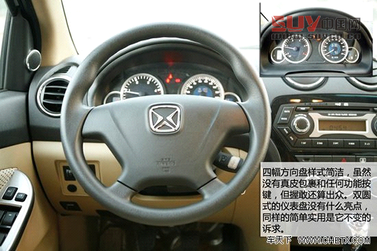 內(nèi)飾做工粗糙是很多自主品牌的詬病,而馭勝S350特裝版的內(nèi)飾做工卻沒(méi)有粗制濫造。上深下淺的內(nèi)飾居家氛圍十足,仿紙紋的黑色臺(tái)面既別致又顯檔次。四幅方向盤(pán)樣式簡(jiǎn)潔,雖然沒(méi)有真皮包裹和任何功能按鍵,但握敢還算出眾。值得一提的是,馭勝S350特裝版的轉(zhuǎn)向助力非常微弱,無(wú)論在駕駛過(guò)程中以及原地打輪時(shí)都得使點(diǎn)力氣才能完成轉(zhuǎn)向,看來(lái)這真是一款為真男人打造的越野車(chē)啊。雙圓式的儀表盤(pán)沒(méi)有什么亮點(diǎn),同樣的簡(jiǎn)單實(shí)用是它不變的訴求。位于兩個(gè)大圓旁邊的兩個(gè)小圓,分別用來(lái)顯示水溫和油箱,一目了然。