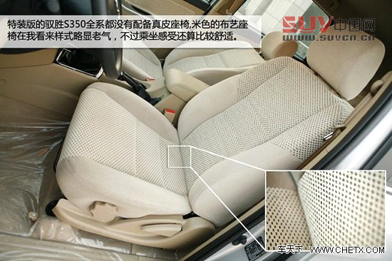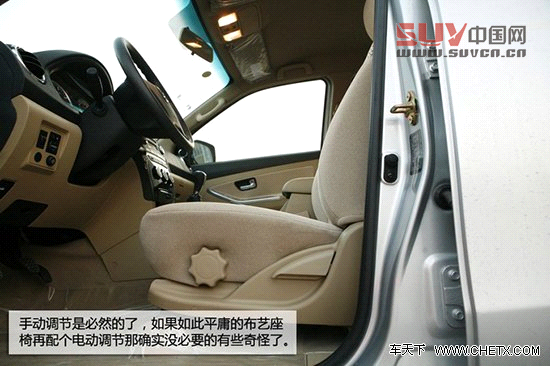 特裝版的馭勝S350全系都沒(méi)有配備真皮座椅,就好像前面提到的液晶屏一樣,真正的越野老玩家也許不需要這些上檔次的配置,耐用盡造才是他們所需要的。米色的布藝座椅在我看來(lái)樣式略顯老氣,不過(guò)乘坐感受還算比較舒適。手動(dòng)調(diào)節(jié)是必然的了,如果如此平庸的布藝座椅再配個(gè)電動(dòng)調(diào)節(jié)那確實(shí)沒(méi)必要的有些奇怪了。前款車(chē)型的迎賓踏板,在特裝版馭勝S350中也消失了,還是秉承那個(gè)原則:沒(méi)用的一律不要。