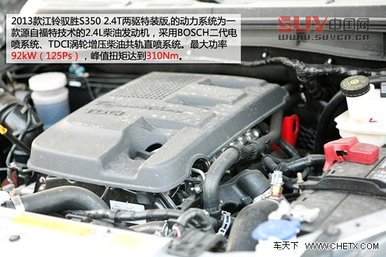 我們本次試駕的車(chē)型是2013款江鈴馭勝S3502.4T兩驅(qū)特裝版,它的動(dòng)力系統(tǒng)為一款源自福特技術(shù)的2.4L柴油發(fā)動(dòng)機(jī),采用BOSCH二代電噴系統(tǒng)、TDCI渦輪增壓柴油共軌直噴系統(tǒng)。最大功率92kW(125Ps),峰值扭矩達(dá)到310Nm。聲大、動(dòng)力猛是柴油渦輪增壓發(fā)動(dòng)機(jī)的共性,這兩個(gè)特點(diǎn)在馭勝S350特裝版中也得以體現(xiàn)。與其搭配的是一款5速手動(dòng)變速箱,并且全系沒(méi)有自動(dòng)擋車(chē)型。說(shuō)到這,我想起了這臺(tái)車(chē)帶給我的第一個(gè)駕駛感受就是離合踏板行程巨長(zhǎng),長(zhǎng)的恨不得腳踩到底都沒(méi)有觸碰到盡頭。
