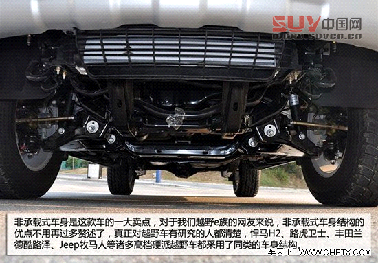非承載式車(chē)身是這款車(chē)的一大賣(mài)點(diǎn),對(duì)于我們?cè)揭癳族的網(wǎng)友來(lái)說(shuō),非承載式車(chē)身結(jié)構(gòu)的優(yōu)點(diǎn)不用再過(guò)多贅述了,真正對(duì)越野車(chē)有研究的人都清楚,悍馬H2(報(bào)價(jià) 參數(shù) 圖片 論壇)、路虎衛(wèi)士(報(bào)價(jià) 參數(shù) 圖片 論壇)、豐田蘭德酷路澤(報(bào)價(jià) 參數(shù) 圖片 論壇)、Jeep牧馬人(報(bào)價(jià) 參數(shù) 圖片 論壇)等諸多高檔硬派越野車(chē)都采用了同類(lèi)的車(chē)身結(jié)構(gòu)。