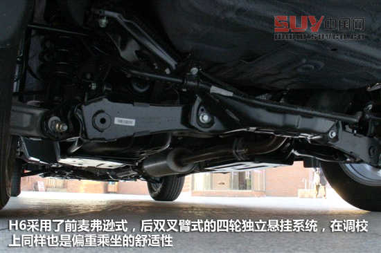 長城哈弗H6采用了前麥弗遜式,后雙叉臂式的四輪獨立懸掛系統,在調教上同樣也是偏重乘坐的舒適性。在通過減速帶或顛簸路面時,懸掛能夠比較好的吸收震動。軟硬相對適中,城市駕駛具有不錯的表現。底盤表現較為扎實,雖然較高的車身使得側傾相對更為明顯,不過哈弗H6的懸掛表現出了足夠韌性。