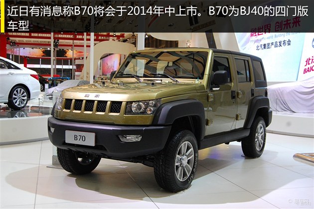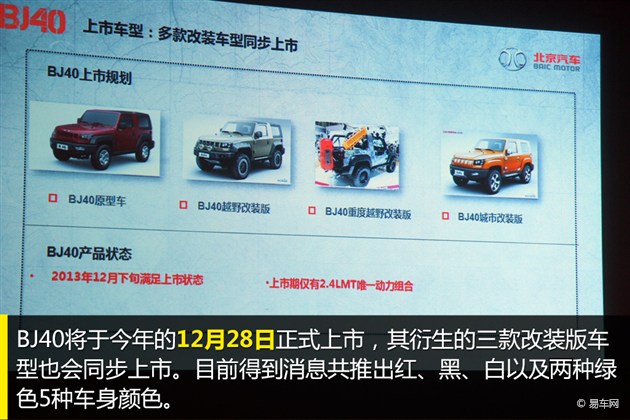 新車消息:北汽BJ40將于今年的12月28日正式上市,其衍生的改裝版車型也會同步上市。目前得到消息共推出紅、黑、白以及兩種綠色。同時其四門版車型B70也會在2014年年中上市。