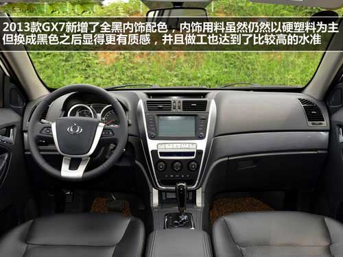 內(nèi)飾:2013款的GX7在內(nèi)飾上只是加入了全黑的內(nèi)飾,在穩(wěn)重之中加入了一些激情。材質(zhì)方面算是交了一份合格的答卷。內(nèi)飾整體設(shè)計感有所增加,左右對稱的翼展式中控臺簡潔而美觀。駕駛席的座椅可進行八方向的電動調(diào)節(jié),乘坐舒適性還算不錯。后排座椅則可進行4/6比例的拆分,并可進行前后調(diào)整和折疊。內(nèi)部空間給了小編很大的驚喜,同級別SUV中,表現(xiàn)不俗。