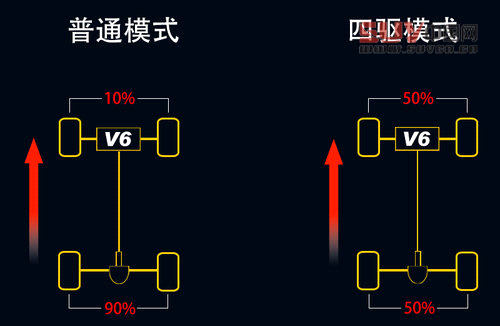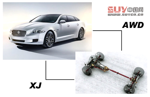 捷豹XJ四驅車型上的AWD適時四驅系統在絕大部分狀態下屬于后驅模式,前輪只有10%的驅動能力,但在濕滑路面上,由于輪胎的打滑,電腦進行計算后,前后均可有50:50的動力輸出。