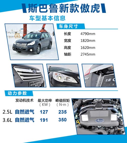 斯巴魯新款傲虎在車身尺寸上的變化并不是很明顯,甚至可以用沒變化來形容,唯一細微的變化只是行李架影響了高度尺寸,對于中國消費者喜歡的車內(nèi)空間則與2013款車型保持一致。動力其依舊搭載的是2.5L以及3.6L兩款自然進氣發(fā)動機,與之匹配的是5AT以及6速CVT,此次試駕的車型很遺憾只有2.5L排量,不過應(yīng)付海拉爾的冰雪路面足矣了。