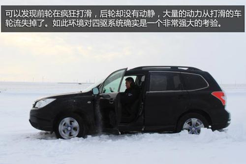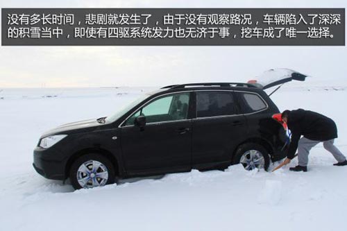 場地試駕過后,開始了自由駕駛環(huán)節(jié)。面對一望無際的寬闊雪場,可以隨心所欲的撒歡,實(shí)在是太過癮了。可是沒高興多長時(shí)間,悲劇就發(fā)生了,由于沒有觀察路況,車輛陷入了深深的積雪當(dāng)中,即使有四驅(qū)系統(tǒng)發(fā)力也無濟(jì)于事,挖車成了唯一選擇。通過圖片可以發(fā)現(xiàn)前輪在瘋狂打滑,后輪卻沒有動靜,大量的動力從打滑的車輪流失掉了。