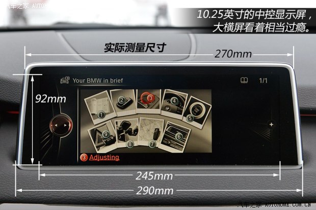 一坐進車內視線就被中控頂端大液晶屏吸引過去,官方資料顯示尺寸為10.25英寸,我把實際測量的長寬數據也標注在了圖中,在它的襯托之下,iPhone5顯得格外小巧。這塊屏幕的分辨率以及軟件響應速度都能令人滿意,用慣了蘋果產品再轉到這兒來,不會覺得難受。