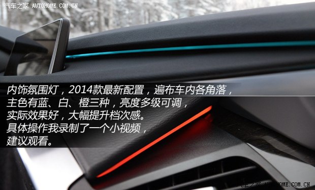 內飾氛圍燈是最新出現的一項配置,燈帶遍布在車廂內四周,主色有藍、白、橙3種,另外還用這三種顏色排列組合出6套組合,所以總共有9個顏色方案供選擇,亮度也可以多級調節。這項配置對內飾檔次感的提升非常有幫助,尤其夜間視覺效果上佳。