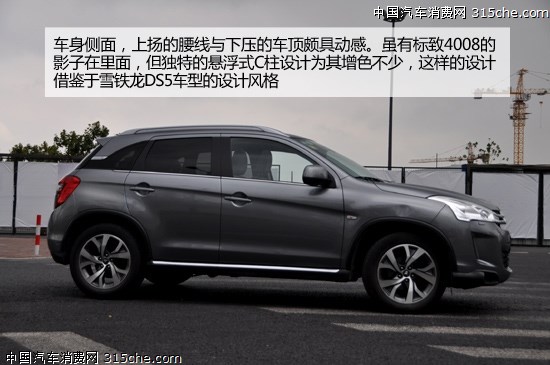 車身側(cè)面,上揚的腰線與下壓的車頂頗具動感。雖有標(biāo)致4008的影子在里面,但獨特的懸浮式C柱設(shè)計為其增色不少,這樣的設(shè)計借鑒于雪鐵龍DS5車型的設(shè)計風(fēng)格。