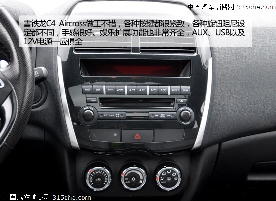 雪鐵龍C4Aircross做工不錯,各種按鍵都很緊致,各種旋鈕阻尼設(shè)定都不同,手感很好。娛樂擴展功能也非常齊全,AUX、USB以及12V電源一應(yīng)俱全。