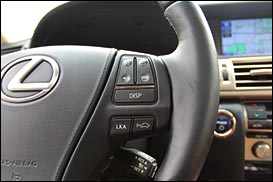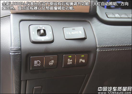 在儀表臺左側位置處全新LS600hL設有后視鏡調節功能、大燈自動照明、方向盤加熱、盲點監視器以及預碰撞輔助功能。按鍵一目了然操作簡便。而下方則是油箱蓋及后備箱蓋開啟開關。