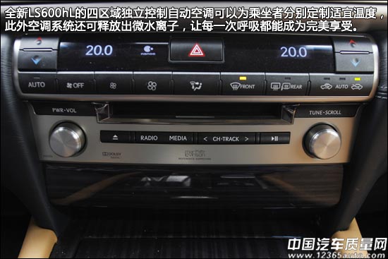 下部分中控面上的按鍵設計同樣非常精致,按鍵的阻尼感都恰到好處, 四區域獨立控制自動空調,可以為駕駛者帶來前所未有的舒適享受,與此同時,空調系統還配備了微水離子發生器,可以使得車內空氣更加清新,對于最近霧霾嚴重的空氣來說真是受益匪淺。另外車內多媒體選用了Mark Levinson 7.1聲道環繞立體聲系統音響,并且在全車配備了19個揚聲器,能夠使得對音樂挑剔的乘駕者一個無可挑剔的聽覺盛宴。此外雷克薩斯對G-BOOK智能副駕系統進行了更新升級,在原有服務的基礎上又增加了地圖更新服務、智能手機應用、手機發送目的地服務及城際間高速路交通信息服務四項全新服務內容。