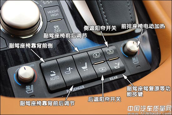 而在中控臺最后一排則還設有一排功能按鍵,其分別為前排座椅電動加熱、副駕座椅靠背前倒、副駕座椅靠背前后調節、副駕座椅前后調節、后遮陽簾開關、側遮陽簾開關,副駕座駕復原等功能按鍵,雖然按鍵眾多但操作起來十分清晰便捷。