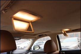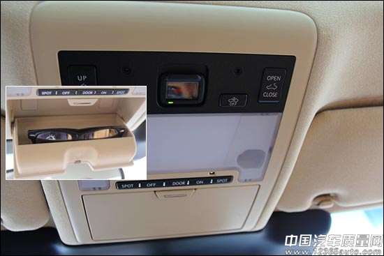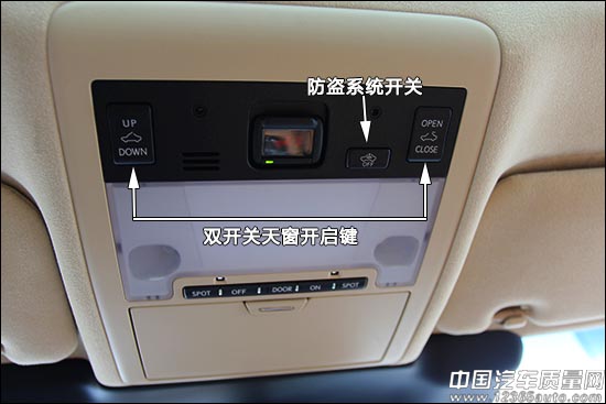 在頭頂部為天窗控制區,全新LS600hL同樣采用雷克薩斯的分體式開關設計,天窗的兩種開啟方式分別進行控制,并且采用一鍵式開啟功能,而車內防盜系統按鈕也在此位置,同時G-BOOK緊急呼叫信息按鈕也在此處。