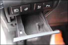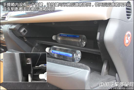 在儲物方面,全新雷克薩斯LS600hL的前后車門兩側各設有可延展儲藏格,可以放入一些重要的合同文件。在儀表臺左側還設有一個小的儲物格,可以放置一下零錢硬幣之類的物品。手套箱內總體空間還算可以,能夠將隔板拆開儲存一下較大物品,如果按上隔板可以放下兩瓶水大小的物品,值得一體,的是手提箱內設有一個按鍵,該按鍵可以將后備箱鎖死,鎖死后后備箱開關以及車鑰匙都無法將后備箱打開。遮陽板的背板上設有卡槽,可以將加油卡、銀行卡等插入其內,伸手可得。前中控臺位置處設有兩個可以放置飲料的水杯槽。前中央扶手箱可圈可點,內置一個USB接外接音源口。同時在頭頂上方還設有一個可隱藏的眼鏡盒,使用起來也十分方便。