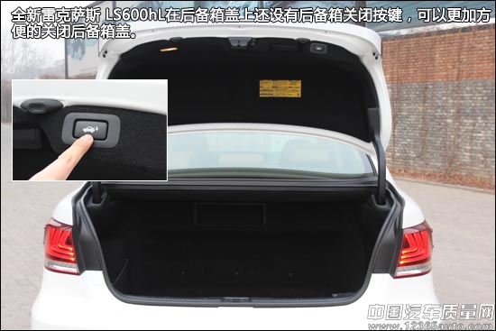 全新雷克薩斯LS600hL的后備箱容積為450L。相對來說有些狹小,不過還是可以放置一些物品的。另外,在后備箱蓋上還設有后備箱關閉按鍵,可以更加方便的關閉后備箱。