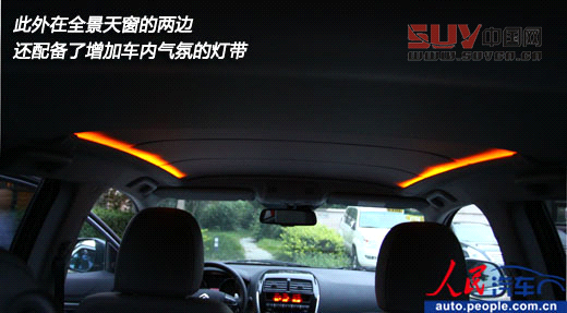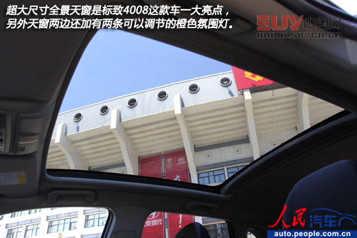 超大尺寸全景天窗是標致4008這款車一大亮點,另外天窗兩邊還加有兩條可以調節的橙色氛圍燈。